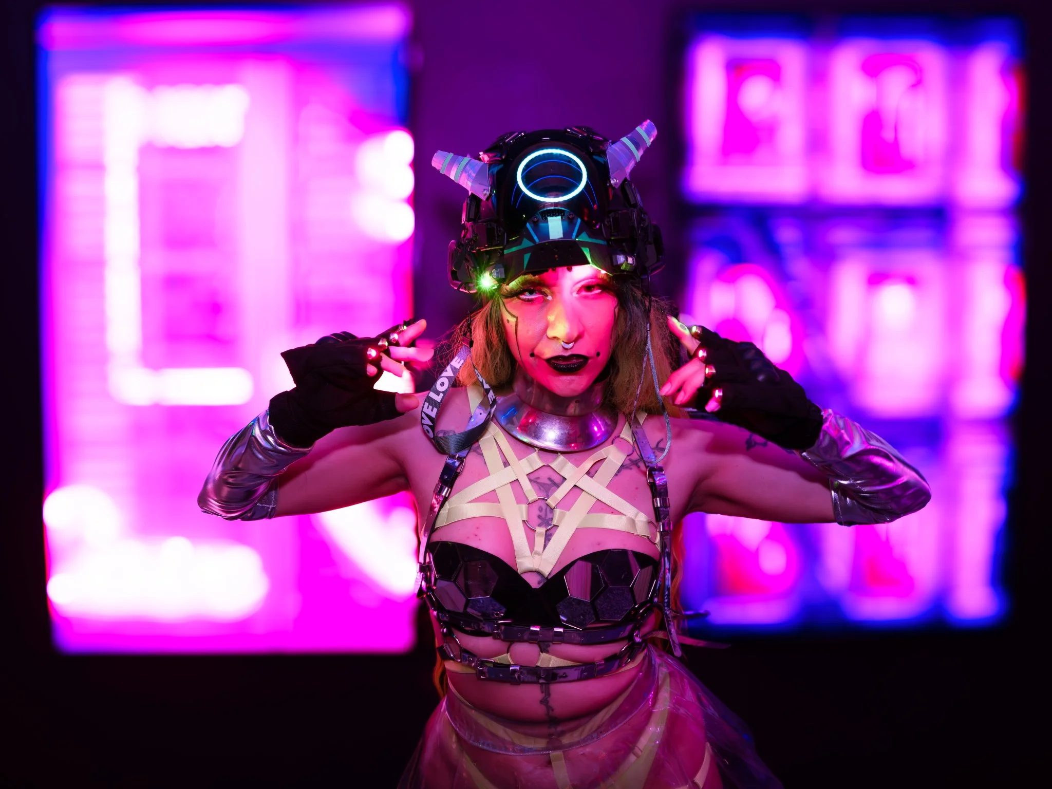 A woman dressed in futuristic, cyberpunk-style costume with metallic accessories and glow-in-the-dark elements, wearing a helmet with horns and a neon circle, standing in front of vibrant pink and purple neon-lit background.