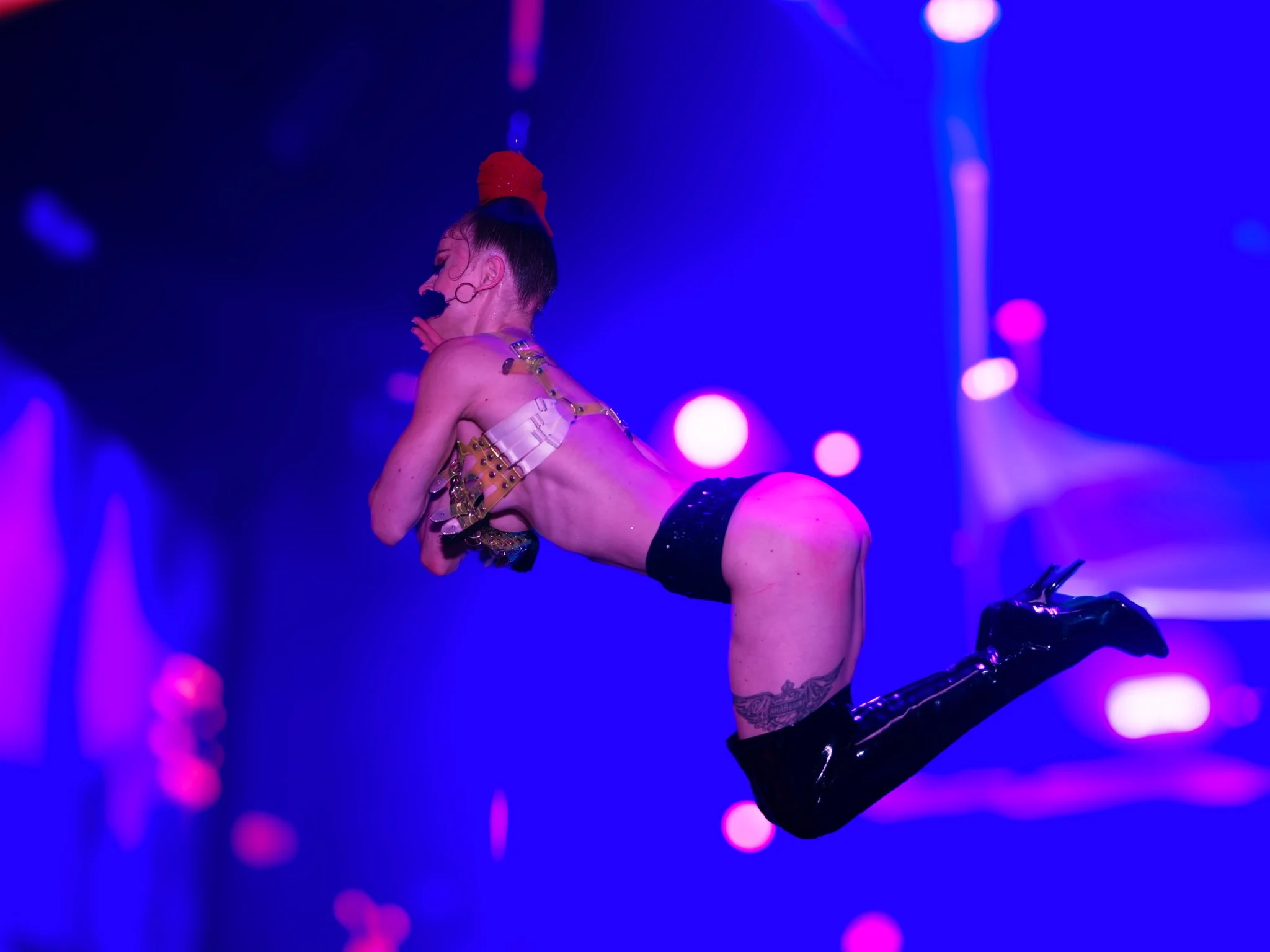 A performer on stage dressed in a provocative costume with black thigh-high boots, black shorts, and colorful accessories, surrounded by purple and pink stage lights.