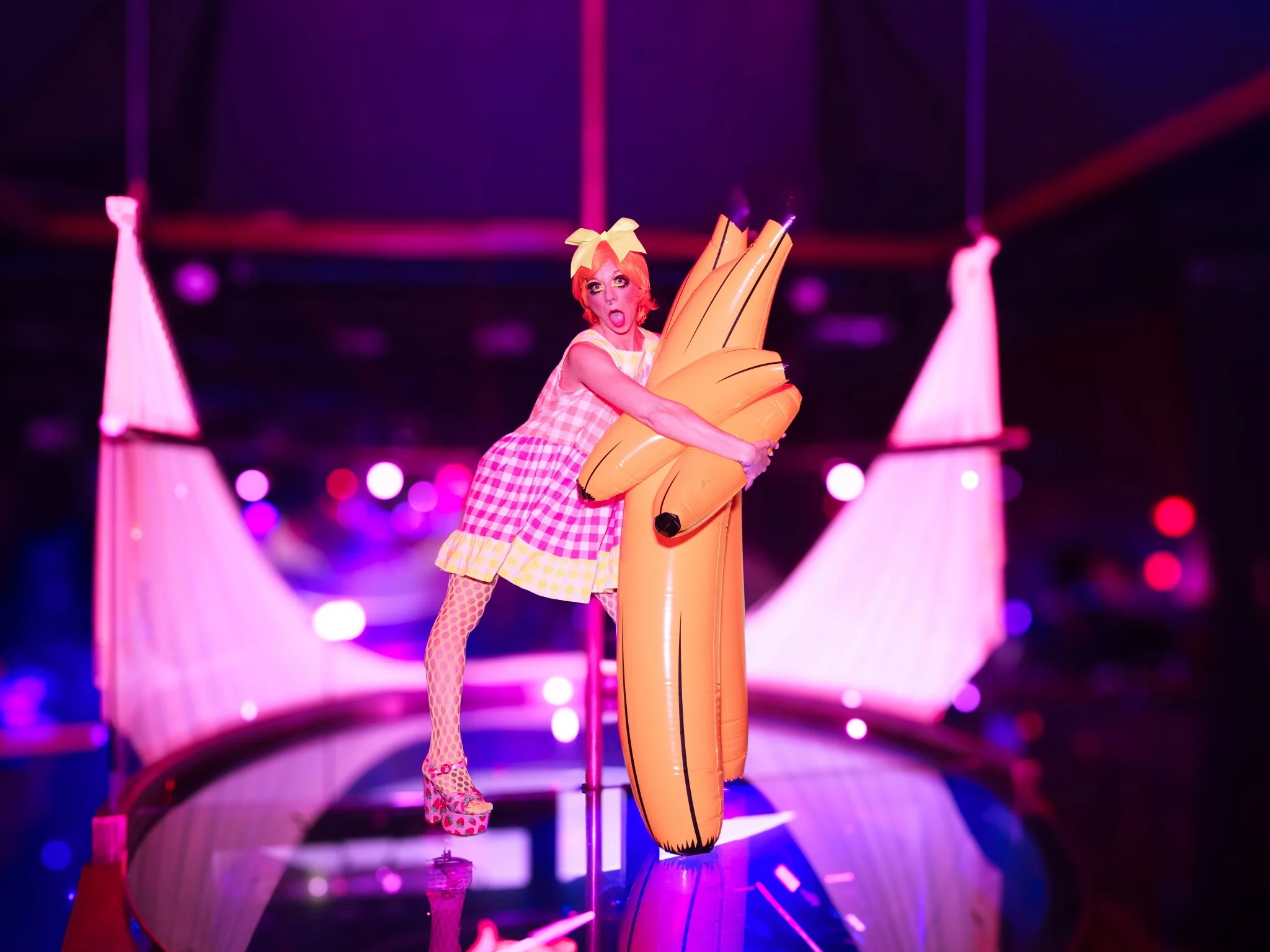 A woman in colorful clothing and wig, hugging an inflatable banana on a stage with pink and purple lighting and sailboat decorations in the background.