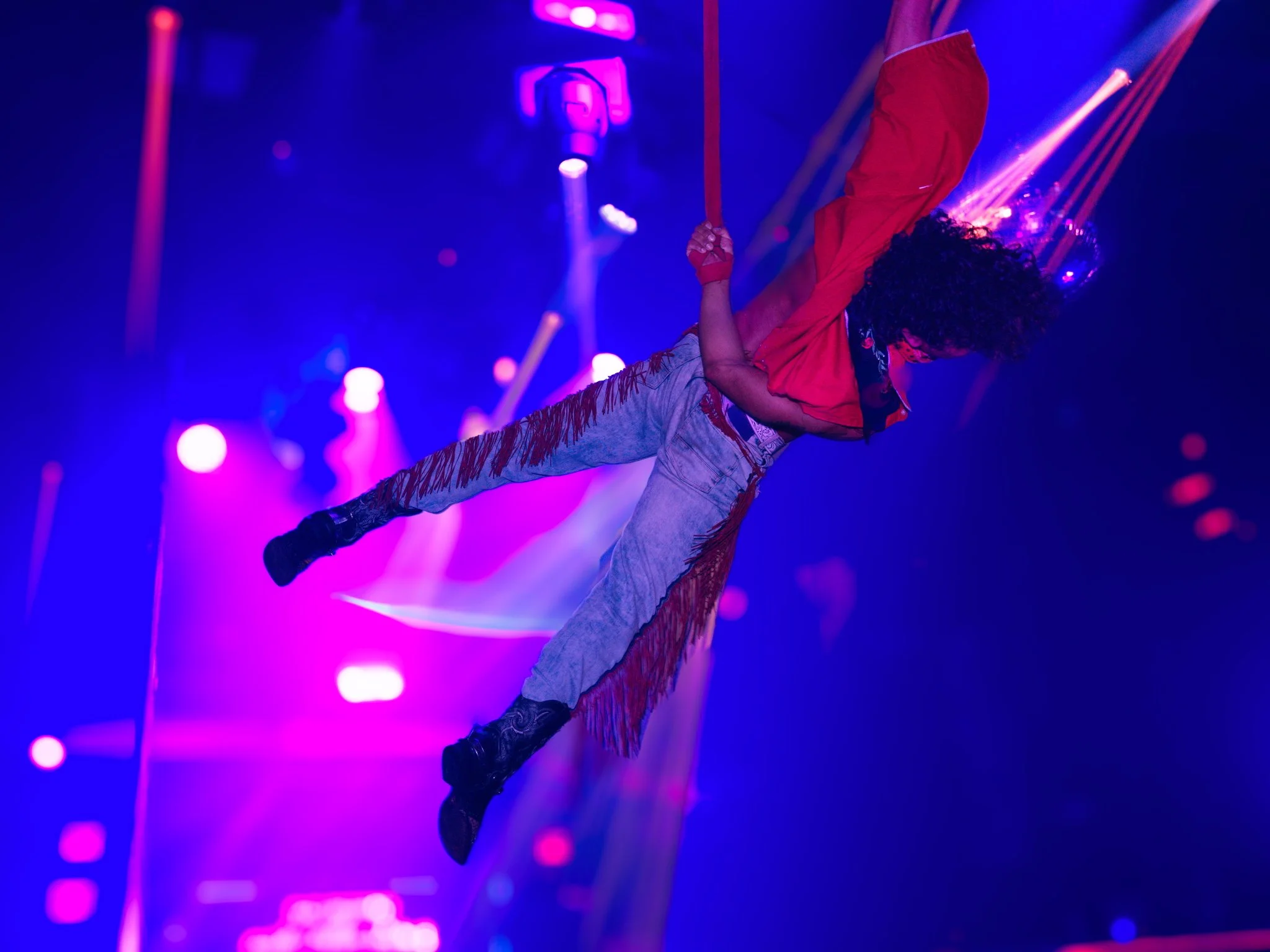 A performer in a red jacket and jeans with fringe flying, hanging upside down on a red trapeze in a colorful, illuminated stage with purple and blue lights.