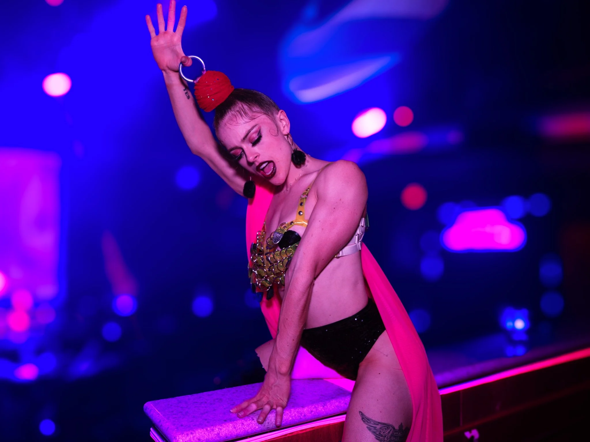 A performer with short hair, dark makeup, and tattoos, wearing a yellow and black outfit with a pink cape, dancing on a stage with vibrant pink and blue lighting, holding her hand up with a red hair accessory on her head.
