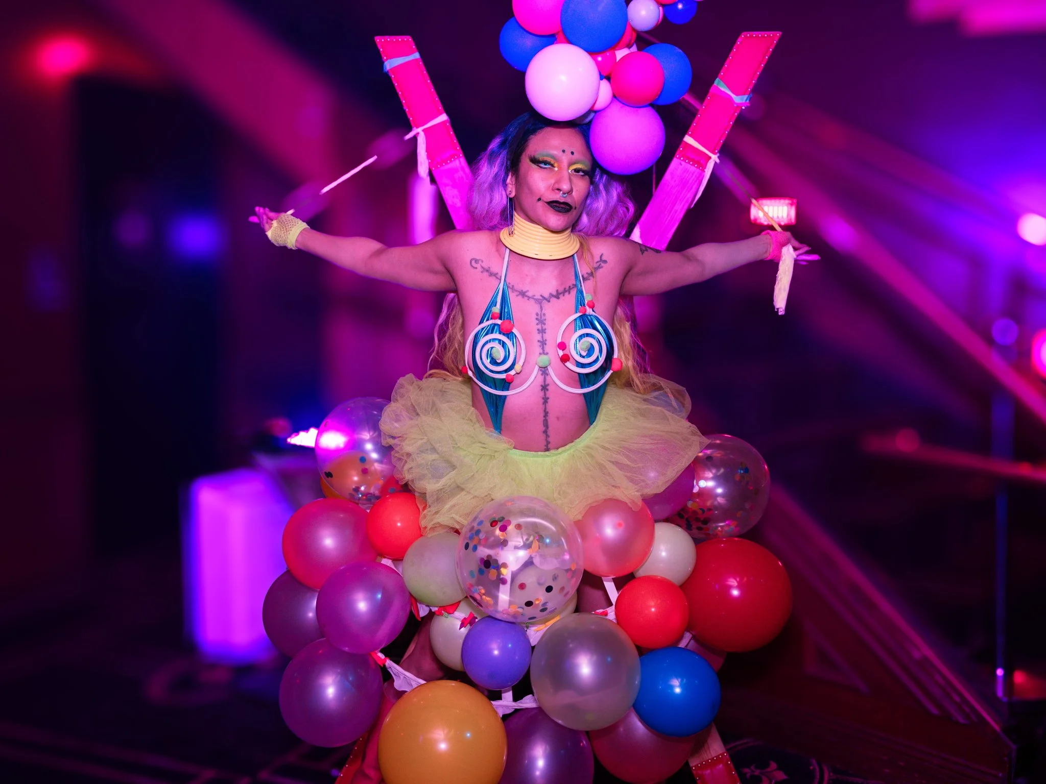A performer in a colorful costume decorated with pink, purple, and blue balloons, raising her arms in front of vibrant pink and purple stage lighting.